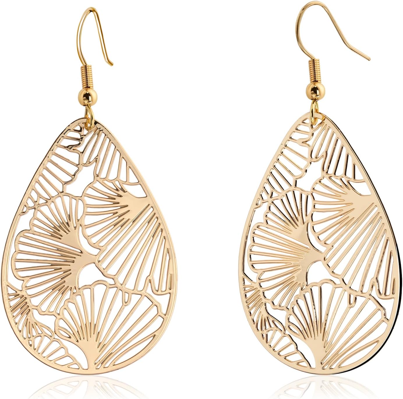 14K Gold Plated Silver Teardrop Filigree Dangle Earrings Lightweight Ginkgo Leaf Drop Earrings for Thanksgiving Christmas Gift